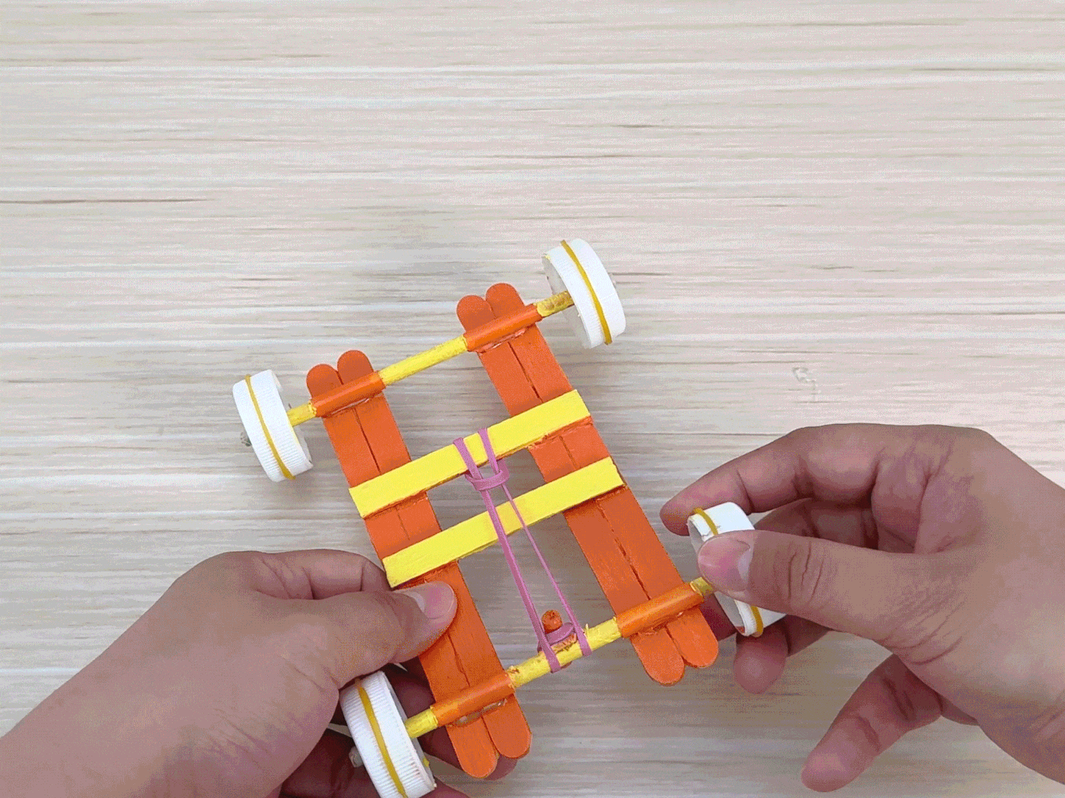 When you stretch and secure the rubber band, elastic potential energy is stored within it. When the rubber band is released, this potential energy rapidly converts to kinetic energy, causing the wheels to rotate and begin moving. Whether the car moves forward also depends on the friction between the wheels and the ground. Friction is the resistive force created when the wheels contact the surface - it will slow the car down and affect how far it travels. If friction is too high, the car might not move smoothly; if it's too low, the wheels might spin without gripping.